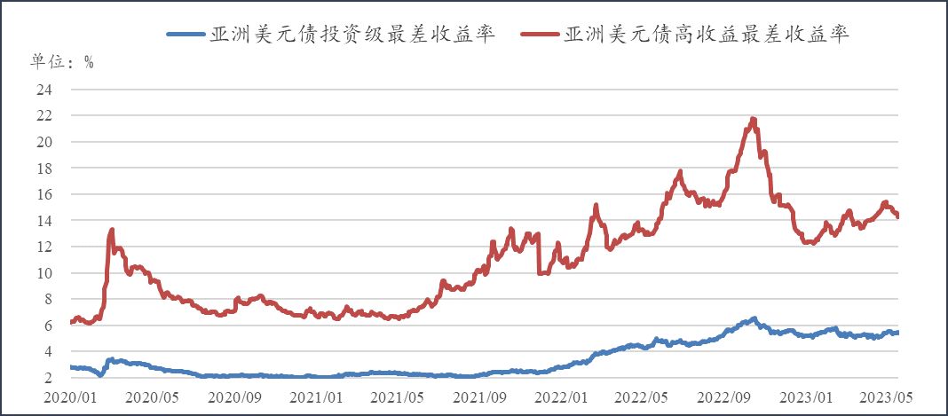亚洲美元债投资级最差收益率5.4702%,较上周上行4.09bp,高收益最差收益率14.2711%,较上周下行37.27bp。